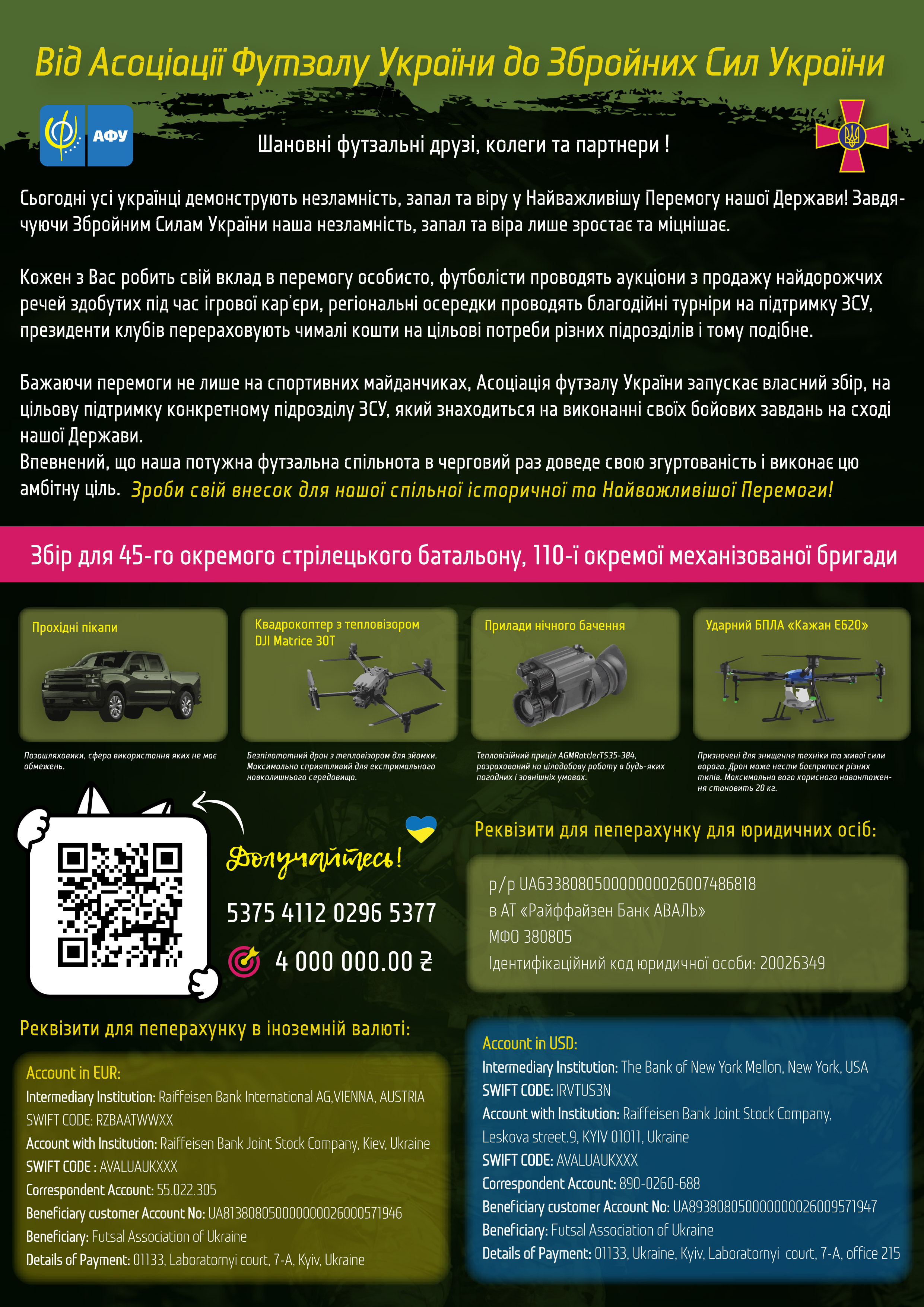 Цільова допомога для 45-го окремого стрілецького батальону, 110-оі окремоі механізованоі бригади. Кошти будуть направленні на придбання мобільного комплекту складенного з автомобілю, ударного дрону, розвідувального квадрокоптеру та приладу нічного бачення